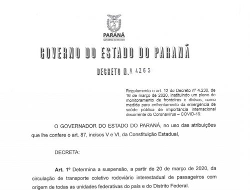 O decreto de nº 4263/2020, assinado pelo governador Carlos Massa Ratinho Júnior nesta quinta-feira, dia 18, suspende a entrada de transporte coletivo rodoviário interestadual de passageiros de todos os Estados e Distrito Federal. A medida visa impedir o avanço do Coronavírus e tem validade de quatorze dias, mas pode ser prorrogado ou revogado.