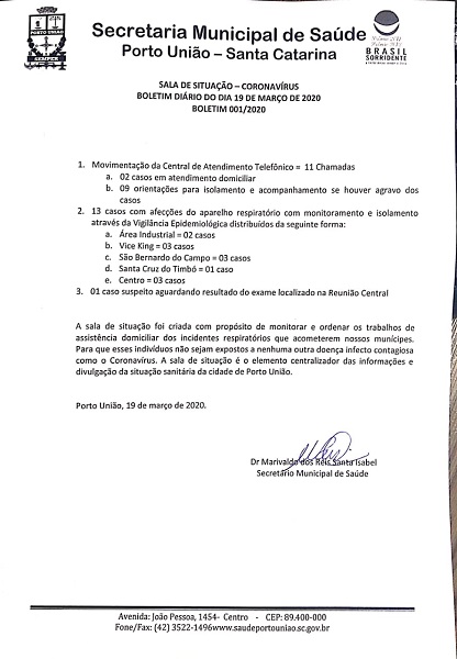 A secretaria de Saúde de Porto União oficializou, nesta quinta-feira, dia 20 de março, a existência de um caso suspeito de Coronavírus na região central da cidade. Outros 11 pacientes que procuraram ajuda via telefone foram atendidos em casa ou estão sob monitoramento. Ainda, 13 estão isolados e monitorados.