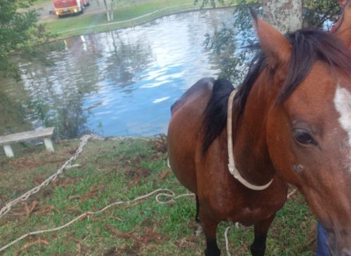 A equipe do Corpo de Bombeiros de Porto União formada pelos Sargentos, Dasko e Marcelo, além dos Bombeiros Comunitários, Isaias e Josias realizaram um salvando de um cavalo que caiu em um açude.