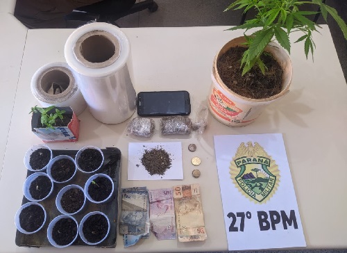 Conforme informações, a Polícia teve conhecimento sobre um homem que tinha em seu desfavor um mandado de prisão, sendo deslocado até seu endereço. No local, a Polícia realizou a abordagem e encontrou na vasa vários vasos contendo plantas in natura com características análogas a maconha.