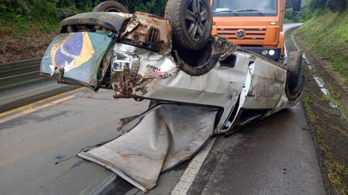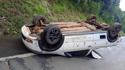 No local, um veículo VW/Saveiro, com placas de Pitanga/PR, conduzido por um jovem de 21 anos, perdeu o controle da direção e capotou, ficando com as rodas para cima.