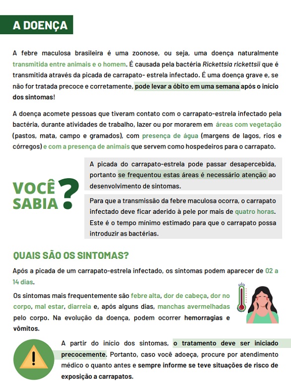 Após a picada de um carrapato-estrela infectado, os sintomas podem aparecer de 02 a 14 dias. Os sintomas mais frequentes são febre alta, dor de cabeça, dor no corpo, mal estar, diarréia e, após alguns dias, manchas avermelhadas pelo corpo. Na evolução da doença, podem ocorrer hemorragias e vômitos. A partir do início dos sintomas, o tratamento deve ser iniciado precocemente. Portanto, caso você adoeça, procure por atendimento médico o quanto antes e sempre informe se teve situações de risco de exposição a carrapatos.