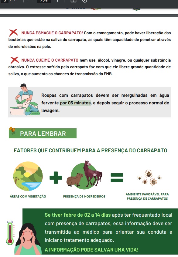 Casos recentes registrados ligaram alerta para a febre maculosa brasileira. Afinal, você sabe o que é, quais os sintomas e como se prevenir? Preocupado com essa questão, as Secretarias Municipais de Agricultura e de Saúde de Porto Vitória ampliaram os cuidados e trazem mais detalhes para a população evitar o contato com carrapatos.