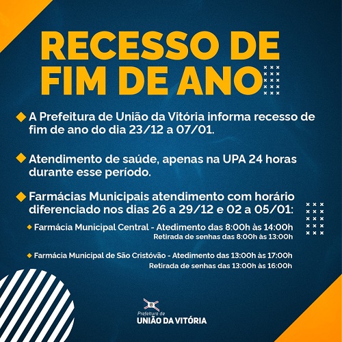 O recesso de final de ano da Administração Municipal de União da Vitória se dará no período de 23 de dezembro a 07 de janeiro de 2024. Neste período, não haverá expediente nos órgãos públicos da Administração Direta e Indireta, com exceção dos serviços essenciais. No próximo dia 08 de janeiro de 2024, segunda-feira, todos os órgãos da Administração voltam ao expediente normal.