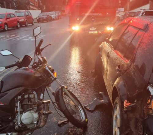 Conforme informações, o acidente ocorreu na rua Padre Anchieta e envolveu uma motocicleta Honda/CG de cor preta e um carro VW/Golf de cor preta.