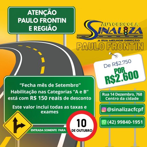 O fecha mês de setembro da Autoescola Sinaliza está incrível. A habilitação nas categorias A e B está com R$ 150,00 reais de desconto e o aluno paga apenas R$ 2.600,00. Este valor inclui todas as taxas e exames e a entrada é somente para dia 10 de outubro.