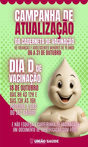 A Prefeitura de União da Vitória iniciou nesta segunda-feira, 06, a Campanha de Multivacinação para crianças e adolescentes, com foco a atualização da caderneta de vacinação. A mobilização, que segue até o dia 31 de outubro, com o Dia D da vacinação no sábado, 18, em todas as Unidades Básicas de Saúde do município.