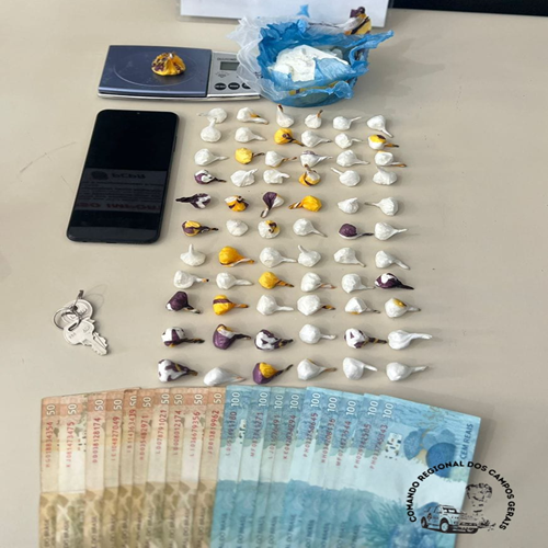 Já por volta das 17h55, a equipe da ROTAM abordou um veículo que estaria efetuando comércio de drogas na região. Um homem estava em seu interior e com ele foi encontrado 11 buchas de substâncias análoga a cocaína. Como era de conhecimento que o suspeito tinha um apartamento exclusivo para a traficância, foi deslocado até