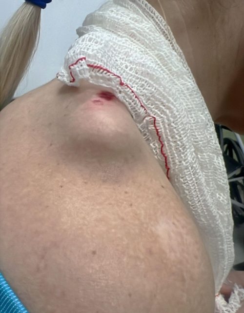 Ao desviar de uma pessoa, ela acabou tendo uma queda e sofreu uma luxação ‘acromioclavicular’. “Fui desviar de um rapaz que estava caminhando na minha direção, e para não bater de frente nele e nem bater em outros ciclistas que vinham no sentido contrário, desviei para o lado do portal de madeira, ali próximo ao lar dos idosos, mas nesse portal havia bastantes cipós e um deles enroscou no guidom da minha bike, e como eu estava clipada, cai no chão batendo forte a clavícula que levantou na hora, dando quase uma fratura exposta”, relembra.