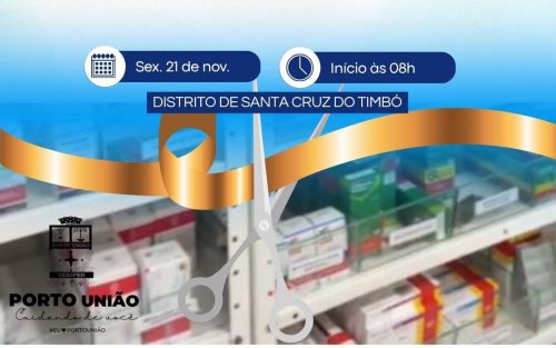 A Prefeitura de Porto União anuncia a inauguração da Farmácia Municipal de Santa Cruz do Timbó, um marco importante na descentralização da atenção básica à saúde e na ampliação do acesso aos serviços para a comunidade local. A inauguração acontece no dia 21 de novembro às 8h.