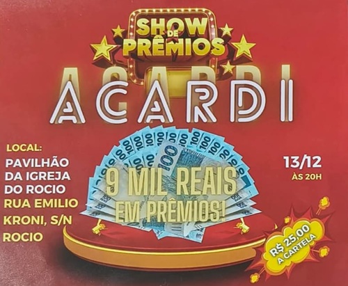 A Associação Casa de Apoio Restauração Divina – ACARDI de União da Vitória vai promover no dia 13 de dezembro, um grande bingo com R$ 9 mil reais em prêmios. As cartelas já estão sendo vendidas.