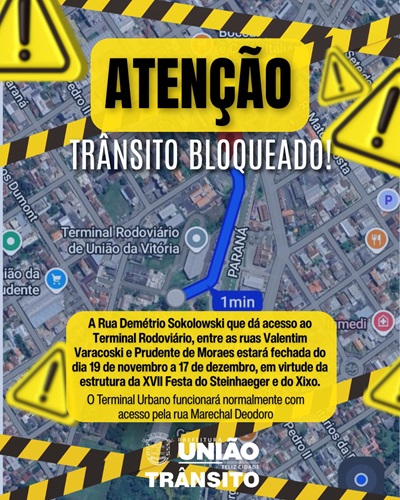 A Secretaria Municipal de Trânsito de União da Vitória informa à população que o acesso e o estacionamento do Terminal Rodoviário Municipal, bem como o acesso à rua Demétrio Sokolowski pela rua Prudente de Moraes, estarão bloqueados a partir desta quarta-feira, 19, para a instalação da infraestrutura da 17ª Festa Nacional do Steinhaeger e do Xixo.