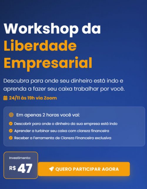 Durante o workshop os participantes irão descobrir para onde o dinheiro da sua empresa está indo, aprender a turbinar seu caixa com clareza financeira, além de receber a Ferramenta de Clareza Financeira exclusiva.