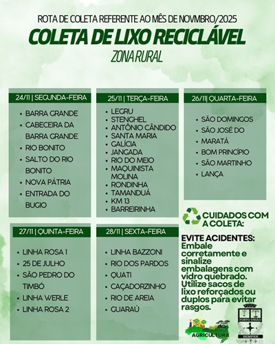 A Administração Municipal de Porto União, por meio da Secretaria de Agricultura divulgou o cronograma da coleta de lixo reciclável na zona rural referente ao mês de novembro de 2025. As rotas serão realizadas entre os dias 24 e 28, contemplando diversas comunidades do interior.