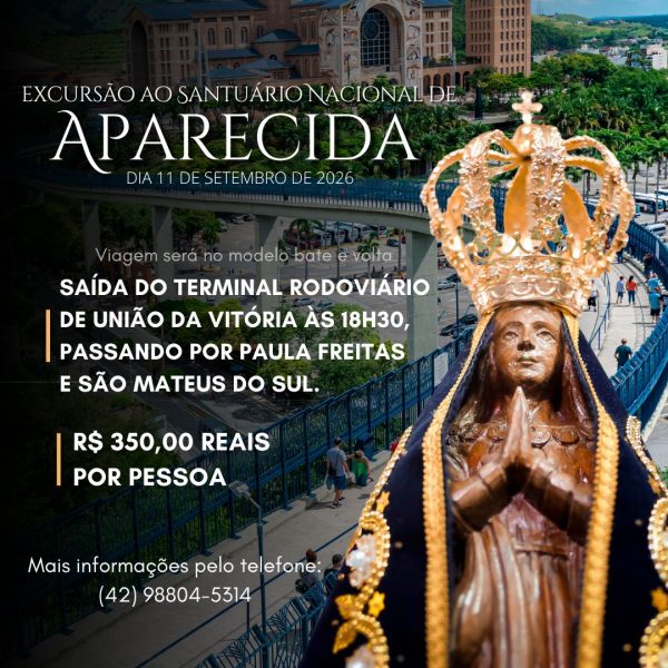 A viagem será no modelo bate e volta e está programada para dia 11 de setembro de 2026, com saída do Terminal Rodoviário de União da Vitória às 18h30, passando por Paula Freitas e São Mateus do Sul. A excursão está sendo organizada pela Elaine e você pode ter mais informações pelo telefone (42) 98804-5314.