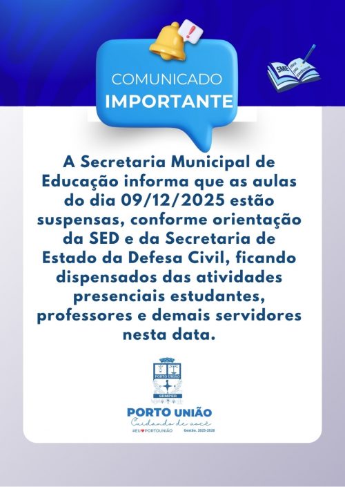 A Secretaria Municipal de Educação de Porto União confirmou a suspensão das aulas da rede pública municipal nesta terça-feira, 9 de dezembro, após orientações da Secretaria de Estado da Educação (SED) e da Defesa Civil de Santa Catarina. Os alertas classificam a região em nível laranja (alto risco) para temporais, chuvas intensas e ventos fortes, com possibilidade de alagamentos, enxurradas e deslizamentos.