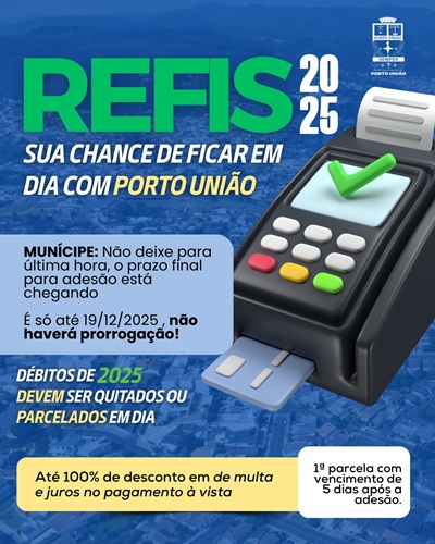 O REFIS 2025 é a oportunidade para você regularizar seus débitos com a Prefeitura de Porto União e garantir vantagens exclusivas oferecidas. O prazo final para adesão está chegando e não haverá prorrogação. A data limite é 19/12/2025.