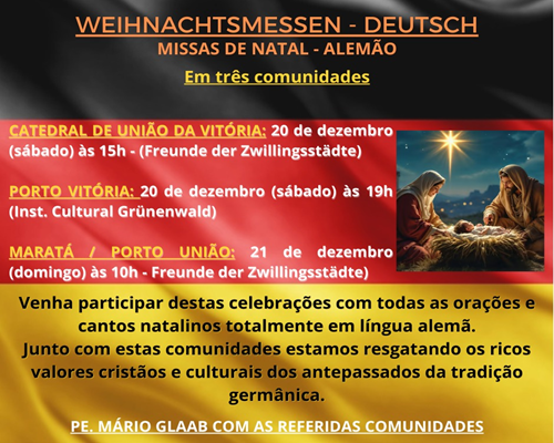 Com a aproximação do Natal, a Diocese anuncia missas rezadas e cantadas totalmente em língua alemã. Nesta ano, serão três comunidades contempladas. No dia 20 de dezembro, às 15 horas, será na Catedral Sagrado Coração de Jesus de União da Vitória, como já é tradição; no mesmo dia 20, às 19 horas, na Matriz São Miguel Arcanjo de Porto Vitória; e, no dia 21, domingo, às 10 horas, na comunidade do Maratá, interior de Porto União.