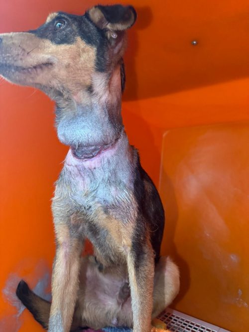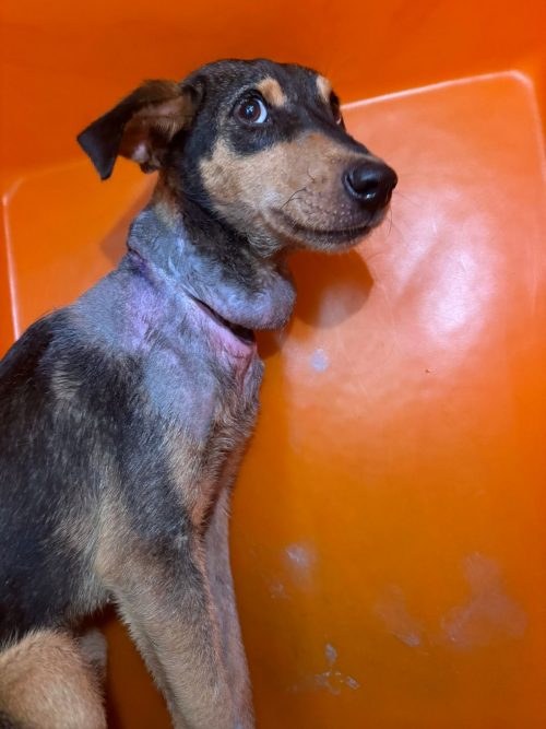 O animal estava amarrado pelo pescoço com um cordão, que acabou causando um ferimento profundo, deixando parte do pescoço em carne viva. Devido ao tempo em que permaneceu no local, o cão apresentava muitas larvas na ferida, além de estar aparentemente magro e com sinais evidentes de maus-tratos.
