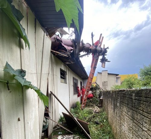 Um pinheiro de aproximadamente 25 metros de altura caiu sobre uma residência na tarde deste sábado (17), em União da Vitória, após a atuação de um forte temporal acompanhado de rajadas de vento. O caso foi registrado na Rua Primeiro de Maio, nas proximidades do Colégio Visão.