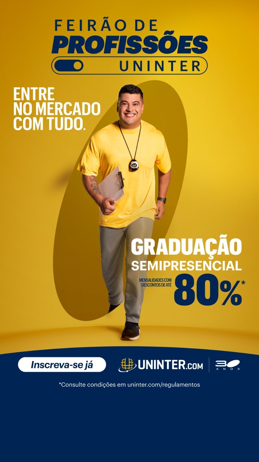 A UNINTER está promovendo o Feirão de Profissões, uma iniciativa voltada a quem deseja ingressar no ensino superior e ampliar as oportunidades no mercado de trabalho. A campanha destaca cursos de graduação semipresencial com descontos de até 80% nas mensalidades, facilitando o acesso à formação acadêmica de qualidade.
