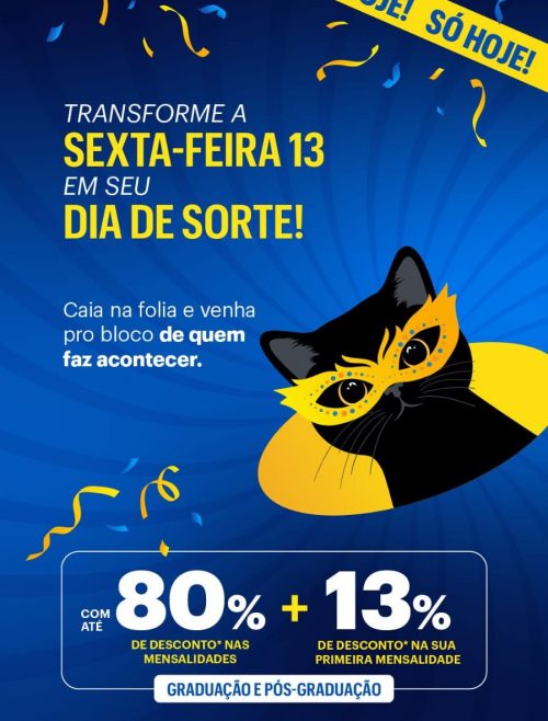 A UNINTER lançou uma campanha promocional voltada a novos estudantes, oferecendo condições especiais para ingresso no ensino superior. A ação utiliza o tema da sexta-feira 13 para associar a data a oportunidades e vantagens financeiras para quem deseja iniciar ou retomar os estudos.