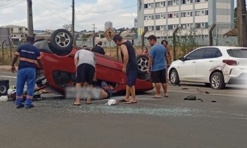 Com a força do impacto, o Palio tombou e ficou com as rodas para cima, chamando a atenção de quem passava pelo local. No veículo estavam duas vítimas — uma mulher e um homem — que sofreram ferimentos.