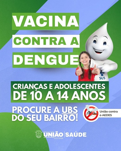A Secretaria Municipal de Saúde de União da Vitória informa que a vacina contra a dengue já está disponível em todas as Unidades Básicas de Saúde (UBSs) do município. O público-alvo da vacinação é formado por crianças e adolescentes com idade entre 10 e 14 anos, conforme definição do Ministério da Saúde.