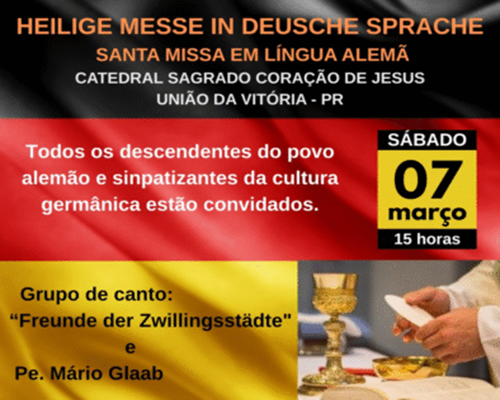 Desta vez será no dia 07 de março às 15 horas, na Catedral Sagrado Coração de Jesus de União da Vitória. A celebração será presidida pelo Pe. Mário F. Glaab e cantada pelo Grupo de Cantos “Freunde der Zwillinsstädte” (Amigos das Cidades Gêmeas).
