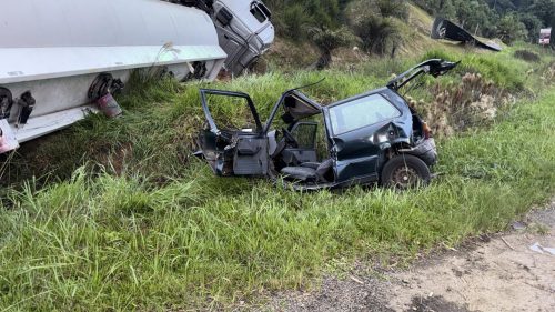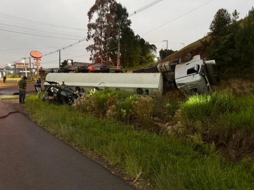 Um acidente registrado nas primeiras horas da manhã desta sexta-feira (10) mobilizou equipes do Corpo de Bombeiros na BR-476, no km 358, na região do Mallon, em frente ao Guincho Forgiarini, em União da Vitória. A colisão envolveu uma carreta-tanque carregada com combustível e um Fiat Uno, e deixou duas pessoas feridas.