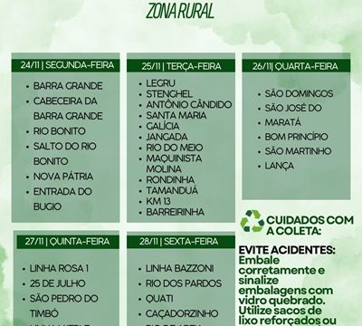 A Administração Municipal de Porto União, por meio da Secretaria de Agricultura divulgou o cronograma da coleta de lixo reciclável na zona rural referente ao mês de novembro de 2025. As rotas serão realizadas entre…